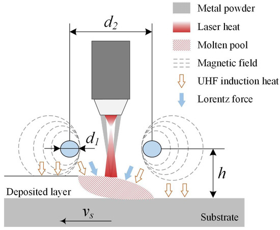 With the development of induction heating technology, the current frequency of induction heat is greatly increased. Ultra-high frequency (UHF) induction heat, with a current frequency higher than 700 kHz, is of good controllability and has a small heat-affected zone. UHF induction heat has recently been applied in the precision forming field, such as metal powder production [14], precision welding [15,16] and rapid sintering of nanocomposites [17]. In view of the technological superiority of UHF induction heat, the microstructure degradation that occurs during temperature gradient optimization may be prevented by introducing UHF induction heat instead of low or medium frequency induction heat to laser deposition. In addition, since the induction coil used in UHF induction heating is commonly of a small dimension, the magnetic field near the molten pool generated during UHF induction heating is more intensive, compared with that generated during the conventional low or medium frequency induction heating process. The intensive magnetic field will produce a Lorentz force, which will further accelerate the metal flow in molten metal. Previous research has indicated that a violent flow in molten metal is helpful in microstructure refinement [18,19]. Therefore, the intensive electromagnetic field during UHF induction heating will also contribute to the microstructure refinement of the deposited layer.