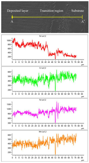 The service performance of the deposited layer is in large part determined by microstructure morphology; a fine microstructure morphology contributes to a better performance of the deposited layer. Figure 3 shows the SEM image of the cross-section of a laser-UHF induction hybrid deposited layer, which was prepared under a current frequency of 850 kHz and current density of 1.14 × 108 A/m2. The thickness of the deposited layer is 0.631 mm. As shown in Figure 4, the element distribution along Line A—A’ that stretches across the laser-UHF induction hybrid deposited layer and substrate is obtained by means of EDS detection. It can be seen that the element content gradually changed from the deposited layer to the substrate, which means that metallurgical bonding between the deposited layer and substrate is obtained. Figure 5 shows the microstructure in the top region of the deposited layer obtained by laser deposition and laser-UHF induction hybrid deposition method. The laser-UHF induction hybrid deposited layer was obtained with a current frequency of 850 kHz and current density of 1.14 × 108 A/m2. According to Figure 3, the top region of the laser deposited layer is mainly composed of coarse cellular grains, and the maximum dimension of these cellular grains is up to 7.8 μm, while in the top region of the laser-UHF induction hybrid deposited layer the microstructure consists of almost equiaxed grains, and the dimension of these equiaxed grains averages 4.82 μm, which means that the laser-UHF induction hybrid deposited layer has a more refined microstructure compared with the laser deposited layer. According to induction heating theory, there is an intensive electromagnetic field during UHF induction heating, which generates a Lorentz force in the molten pool. The Lorentz force has a significant stirring effect on the molten pool, breaking down the developing grains in its solidifying front. Therefore, the nucleation rate is increased, which means a microstructure with fine grain size is obtained.