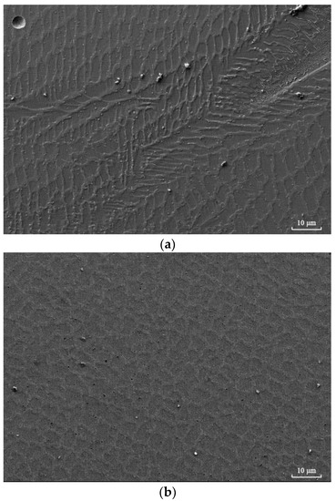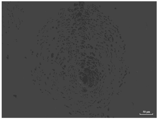 During the corrosion test, a dense passive film is formed at the surface of the deposited layer, which will protect it from further corrosion. This process manifests as an obvious potential increase, with a slight increase in corrosion current density. Due to the continuous increase in potential, the passive film is destroyed by pitting corrosion. Figure 15 shows an SEM image of the pitting corrosion at the surface of the tested layer. It can be seen that there are extensive pits, which tend to expand and join together. Previous research has shown that deposited layers with low breaking-down potential are easily pitting corroded [27]. According to Table 3, the laser-UHF induction hybrid deposited layer obtained with a current density of 1.14 × 108 A/m2 has the highest breakdown potential of 585 mV. As for the laser deposited layer, there is a significant decrease in breakdown potential, which is 277 mV. This means that the laser deposited layer is more easily destroyed by pitting corrosion. Based on the analysis of the polarization curves, it can be derived that, with the addition of UHF induction heat, the corrosion resistance of the deposited layer is significantly improved. In addition, the deposited layer obtained with a current density of 1.01 × 108 A/m2 has a high corrosion potential and breakdown potential and a small corrosion current density, indicating a better corrosion resistance compared with other deposited layers.