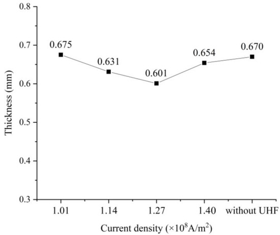 The current density is one of the key processing parameters for UHF induction heating. Figure 9 presents the thickness of the deposited layer, and it can be seen that the thickness varies from 0.601 mm to 0.675 mm, and the effect of current density on the thickness of the deposited layer is not so evident. Figure 10 depicts the microstructure in the top region of the laser-UHF induction hybrid deposited layers under different current densities. It is noticed that the equiaxed grains are the dominant microstructure morphology in the top region of the deposited layer under the four conditions. Comparison of the microstructure in the four conditions shows that the microstructure under current density of 1.01 × 108 A/m2 is significantly coarser than that under the other three conditions. According to the measured results, the grain size under a current density of 1.01 × 108 A/m2 is about 5.32 μm. As the current density increases, the grain size decreases, but the decreasing scale is not so evident. The measured results indicate that the differences in grain size under a current density of 1.14 × 108 A/m2, 1.27 × 108 A/m2 and 1.40 × 108 A/m2 are about 4.12 μm, 3.85 μm and 3.64 μm, respectively. Based on the induction heating theory, the increasing current density means an intensive electromagnetic field, and the Lorentz force in the molten pool is thereby strengthened. Therefore, the stirring effect of the Lorentz force on the molten metal is enhanced, meaning that a fine microstructure can be obtained. However, the increasing current density also improves the UHF induction heat intensity, the thermal condition would be favorable to grain growth, and the refining effect of Lorentz force on the microstructure may be slightly weakened. Therefore, the decreasing scale of the grain size is not so significant as the current density increases from 1.14 × 108 to 1.40 × 108 A/m2.
