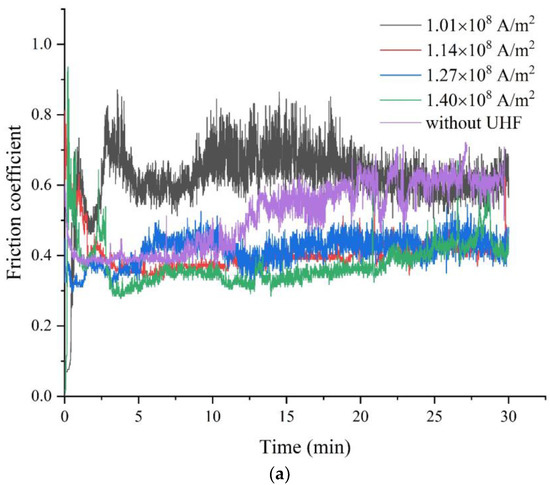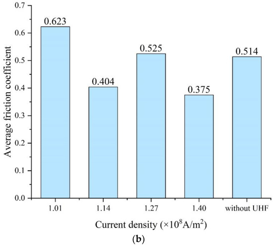 Friction coefficient curves (a) and average friction coefficients (b) of the laser-UHF induction hybrid deposited layers under different current densities.