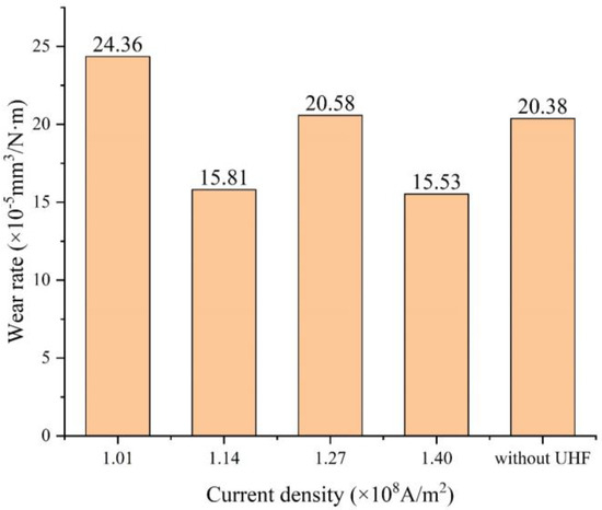 The wear rate of the laser-UHF induction hybrid deposited layers was also evaluated, as shown in Figure 12. It can be seen that the deposited layers fabricated under the current density of 1.14 × 108 A/m2 and 1.40 × 108 A/m2 have a relatively low wear rate of 15.81 × 10−5 and 15.53 × 10−5 mm3/N·m, respectively, indicating good wear resistance. However, the deposited layer obtained with the current density of 1.01 × 108 A/m2, which is of the highest friction coefficient among the tested layers, also shows the highest wear rate of 24.36 × 10−5 mm3/N·m. The laser deposited layer exhibits a wear rate of 20.38 × 10−5 mm3/N·m, which is slightly lower than that of the deposited layer prepared by the current density of 1.01 × 108 A/m2.
