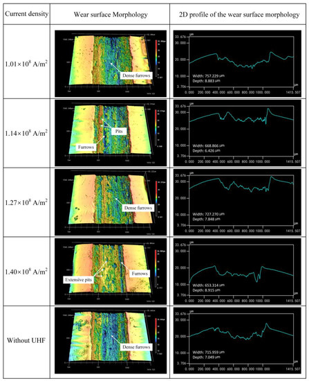 The wear surface morphology and 2D profile of the wear surface morphology of the deposited layers are shown in Figure 13. Dense furrows along the sliding direction are observed in the wear surface of the deposited layers fabricated with a current density of 1.01 × 108 A/m2 and 1.27 × 108 A/m2, indicating an abrasive wear mechanism. The 2D profile of the wear surface morphology demonstrates that the wear track of the two layers is wide and deep. The wear surface morphology of the laser deposited layer also consists of dense furrows, therefore, the wear behavior in this condition is that of abrasive wear. Under abrasive wear condition, masses of wear debris peel off from the surface of the deposited layer, causing a high wear rate, while, for the layers that obtained with a current density of 1.14 × 108 A/m2 and 1.40 × 108 A/m2, the wear surface not only consists of furrows, but also of extensive pits. This means that the surface of the two deposited layers has adhesive wear and abrasive wear. These pits adhere to the wear surface, which plays a role in protecting it [22]. The dimension of the 2D profile of the wear surface morphology also indicates that the wear tracks of the two deposited layers are narrower than that of the other deposited layers, which also demonstrates the good wear resistance of the layers obtained with the current density of 1.14 × 108 A/m2 and 1.40 × 108 A/m2.