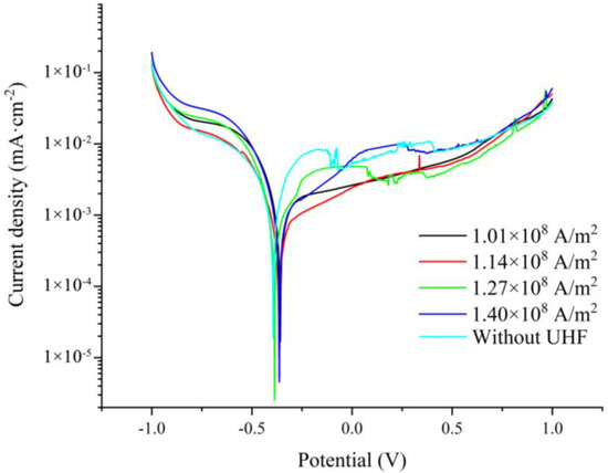 Polarization curves of the laser−UHF induction hybrid deposited layers under different current densities.