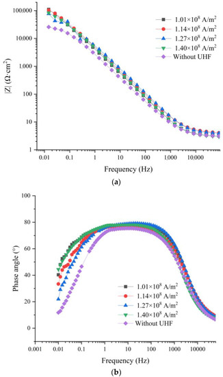 EIS spectra as Bode plot of the laser-UHF induction hybrid deposited layers under the current density: (a) frequency vs. amplitude (b) frequency vs. phase angle.