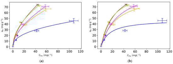 The characterization of hydrochars has been achieved in previous work [8] using elemental analysis, TGA, and FTIR. Adsorption experiments were performed with methylene blue as the model compound. A mass of 10 mg of hydrochar was added to 5 mL of MB dye solution with different concentrations. The pH was fixed to 7 and the stirring rate was 150 rpm. The adsorption capacity was calculated using Equation (1). The equilibrium adsorption data was fitted with Langmuir and Freundlich isotherms using Equations (2) and (3), respectively [10,11].
