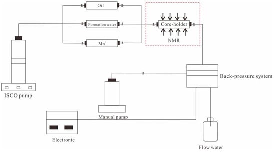 This section briefly introduces the experimental instruments and materials used in this study. The displacement experiment equipment is the LDY-150 high-temperature and high-pressure dynamic displacement system (Figure 1). The displacement pump is Microke 3PB-1045II, the displacement pressure is 0–58 MPa, and the flow rate control range is 0.01–15 mL/min. Hand pump and intermediate containers are produced by Huaxing Petroleum Company. In addition, the core holder comprises PEEK nonmagnetic material and can withstand up to 35 MPa pressure and up to 85 °C temperature. Fluorine oil without a hydrogen core is utilized in the experiment to replicate formation pressure by applying confining pressure to the holder. Moreover, the pressure control range for the backpressure control mechanism of the manual pump is 0–50 MPa. The abovementioned equipment was manufactured by Jiangsu Huaxing Petroleum Instrument Co.,Ltd. The core observation equipment is the Oxford Geospec2/53 nuclear magnetic resonance test system, which was manufactured by Shanghai Nuomai Company; the temperature is 32 °C, the permanent magnet is 2 MHz, the magnetic field strength is 0.5 T, the frequency range for RF pulses is 1–20 MHz, and the frequency control precision is 0.01 MHz.