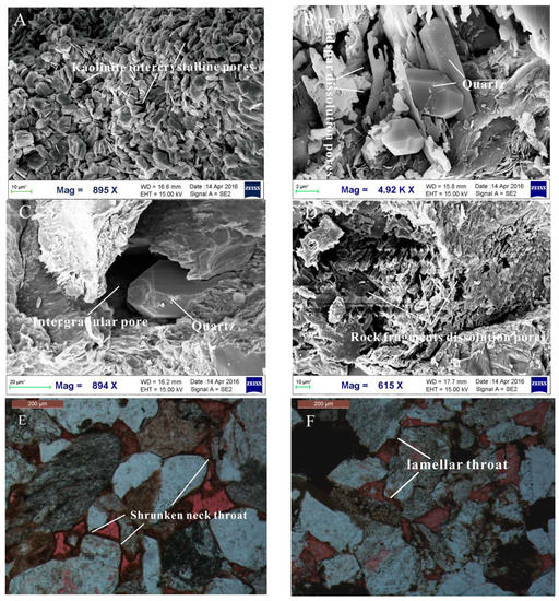 (A) Kaolinite intercrystalline pores (Sample No. 10); (B) Feldspar dissolved pore, locally developed quartz (Sample No. 8); (C) Intergranular pore, locally developed quartz (Sample No. 4); (D) Rock fragment dissolution pores (Sample No. 6); (E) Shrunken neck throat (Sample No. 1); (F) lamellar throat (Sample No. 7). Typical pore and throat types of Chang 8 reservoir.