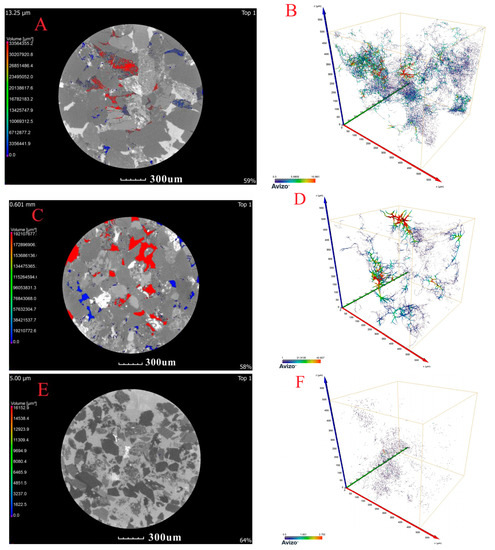 (A) Top view of pore distribution (Sample No. 1); (B) Three-dimensional structure model of throats (Sample No. 1); (C) Top view of pore distribution (Sample No. 8); (D) Three-dimensional structure model of throats (Sample No. 8); (E) Top view of pore distribution (Sample No. 10); (F) Three-dimensional structure model of throats (Sample No. 10); Sample Nano-CT scanning image.