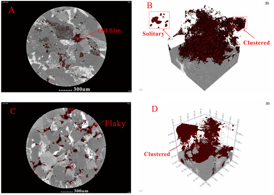 The two-dimensional scanning section of residual oil reveals that the Type II reservoir represents the development of some micro pores and a certain amount of dissolution pores in sample No. 1. The residual oil is mostly found in medium- and large-sized pores, but the tight oil in pores of tiny sizes is scarce. Oil film is the predominant form, and the main occurrence form is oil film. Figure 4A,B show that the tight oil is dispersed throughout the core samples. The oil distribution is dispersed when close to the core surface, and the oil distribution is compact when close to the core. This phenomenon is due to the location of most medium and large pores inside the center part of the core and the surface is mainly distributed with small dispersed pores. The pore connectivity in the central part is also good, and the occurrence form is clustered and solitary. The Type I reservoir represents sample No. 8 with additional intergranular, medium, and large pores distributed in planar sheet and a few micro-pores. Figure 4C,D show that oil mainly occurs in medium and large pores and is uniformly distributed in the core, and the occurrence form is mainly flake and cluster. The residual oil volume of sample No. 8 is 137,196,645.1 μm3, which is approximately 2.8 times that of sample No. 1, and the porosity is larger than that of sample No. 1 (7.8%) with good pore connectivity. Type III reservoirs were not scanned because they were too tight, had poor pore–throat structure, and had substantially low residual oil content (<0.5%).