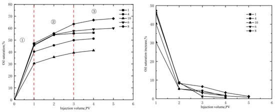 Oil saturation can successfully assess the oil content of the reservoir and evaluate its performance [44]. The NMR technique indicates that the oil saturation after oil charging is the ratio of the covered area under the T2 spectrum after each displacement to that under the T2 spectrum of saturated water formation (Equation (1)). The change in oil saturation under different displacement states is calculated in accordance with the T2 spectrum distribution of NMR by using the curve integral method.