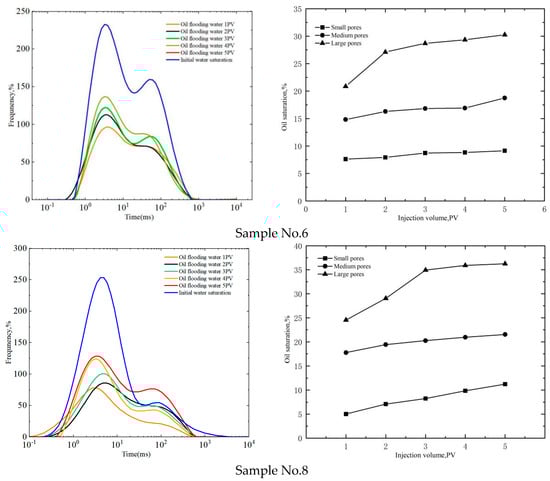T2 spectrum distribution of representative cores (Nos. 6 and 8) of Type I in the charging process and changes in oil saturation in different pores.