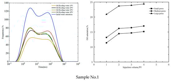 The pores can be categorized into three types based on the T2 spectrum distribution of Type I reservoir for sample Nos. 6 and 8 during the charging process: small pores (0.1 ms < T2 ≤ 16 ms), medium pores (16 ms < T2 ≤ 110 ms), and large pores (>110 ms). Figure 6 shows that the wave peaks corresponding to small and large pores gradually increase as charging quantity rises. This condition indicates that an increasing amount of oil steadily entered the large and small pores until the core reached the saturated oil state with increasing charging volume. The rise in oil content in pores of various diameters is variable when the charging volume is 1 PV. Large and medium pores have higher oil saturation than small pores. This finding proves that oil preferentially enters large and medium pores and then enters micro pores. With the charging progress, the oil content in small pores rises slowly. The content of oil in large and medium pores increases faster than that in small pores. Compared with the two samples, the oil content in the small pore of sample No. 8 increased faster than that of sample No. 6. After flooding, the oil saturation of sample No. 8 (68.01%) was larger than the sample no. 6 (59.84%). This finding can be attributed to the good pore permeability of sample No. 8, the large overall pore volume, the good overall pore connectivity, and the large throat. These conditions facilitate the easy storage of oil and contribute to its abundance.