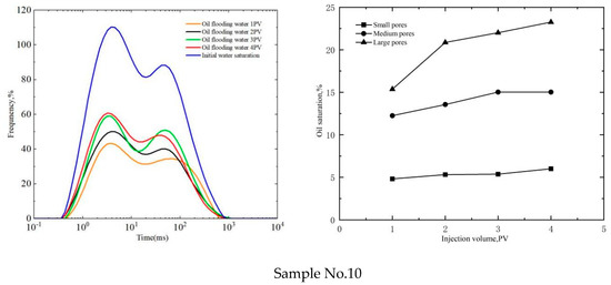 Type III reservoir represents the pore size range of sample No. 10, which is divided into small pores (0.1 ms < T2 ≤ 10 ms), medium pores (10 ms < T2 ≤ 100 ms), and large pores (T2 > 100 ms). As illustrated in Figure 8, an increase in wave peak related to small pores in reservoir Type III is less than that corresponding to large pores. That is, the connectivity between these pores and the pore permeability are both poor despite the substantial small pore content of Type III. These conditions are unfavorable to the flow and presence of oil in the pores. Reservoirs of Type III contain fewer medium and large pores compared with those of types I and II. Low porosity and permeability are the primary reasons of insufficient oil saturation in pores of medium and large sizes.