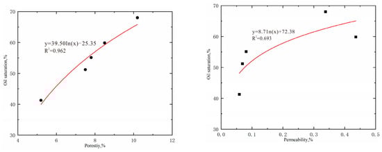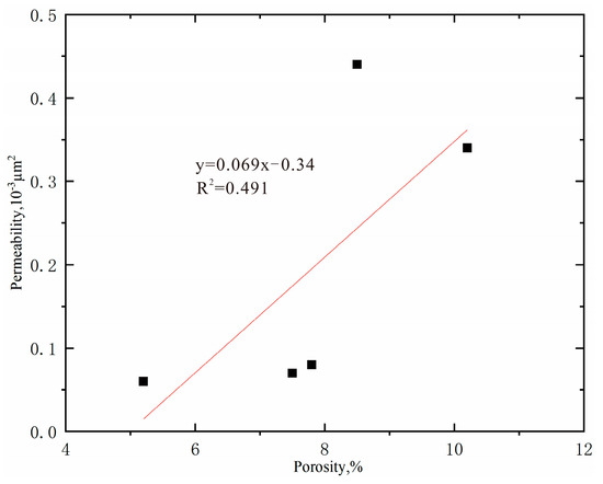 After the charging experiment, the correlation analysis between oil saturation and porosity and permeability of five core samples was carried out. Oil saturation is positively correlated with porosity and permeability. It has a stronger positive correlation with porosity (Figure 9). However, the correlation between the porosity and permeability of the samples is not strong (R2 = 0.491) (Figure 10). The permeability mainly affects the flow ability of fluid between rock pores. The higher the permeability, the stronger the flow ability of fluid in the reservoir. Porosity represents the number of pores in the sandstone reservoir. The larger the porosity, the more void content in the reservoir, and the more fluid can be stored. Due to the low permeability of tight sandstone reservoirs, the average permeability of samples in this study was only 0.22 × 10−3 µm2. Therefore, porosity plays a greater role in the occurrence of tight oil in tight sandstone reservoirs.
