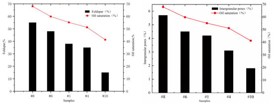Figure 11 depicts type I and II reservoir representative samples No. 8, 6, 1 and 4 with high intergranular pore content and developed secondary pores, which have a high oil saturation. The absolute content of intergranular pores and feldspar in core 10 of Type III reservoir is only 1.80% and 15.2%, respectively, demonstrating the lowest oil saturation. This phenomenon occurs due to intergranular pores (large reservoir space), which are the optimal pore type for tight sandstone reservoirs. Generally, if the pore connectivity is good and the secondary pores are well developed, then tight oil formation is improved and the amount of tight oil is large. The development of secondary pores can provide more seepage channels and improve the seepage capacity of the reservoir. Feldspar is the most abundant soluble mineral in sandstone reservoirs. Intergranular dissolution, intragranular dissolution, and dissolution expansion pores are generated as a result of the dissolving of feldspar particles, providing space for the occurrence of tight oil. Therefore, the high content of feldspar pores increases the oil saturation.