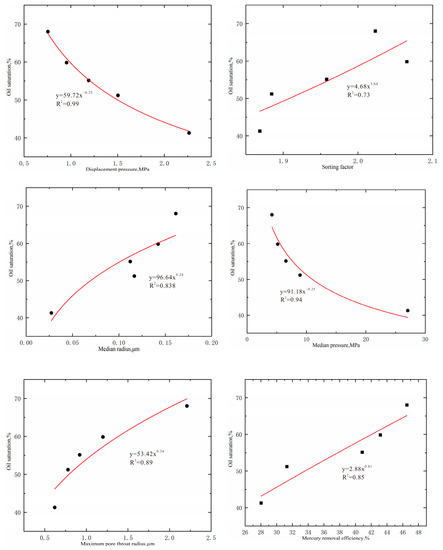 Relationship between oil saturation and displacement pressure, sorting factor, median radius, median pressure, maximum pore throat radius, and mercury removal efficiency.