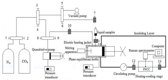 The solubility of CO2 in n-decane and n-decane + n-hexane system at 303.15 to 353.15 K and 0 to 15.0 Mpa was carried out on a fused silica capillary cell (FSCC) with an in situ Raman spectroscopy, which is described in Figure 1. It consisted of a FSCC combined with a heating–cooling stage (Linkam, CAP500, Redhill, UK), an in situ Raman spectroscopy (Horiba JobinYvon, HR800, Palaiseau, France), a phase equilibrium kettle with a magnetic stirrer and an electric heating jacket, a manual pressure pump, a 70 MPa pressure generator, a circulating pump, and a quantitative pump. The temperature in the phase equilibrium kettle was controlled by the electric heating jacket (accurate to ±0.1 °C), and the temperature in the FSCC was controlled via the heating–cooling stage in conjunction with a digital temperature controller (Linkam, T95, Redhill, UK, accurate to ±0.1 °C). The connecting tube between the FSCC and phase equilibrium kettle was wrapped with an insulation layer to maintain the fluid temperature in the whole setup. The pressure in the FSCC and phase equilibrium kettle was adjusted with the 70 MPa pressure generator and measured with a Setra 206 pressure transducer (70 MPa full scale, accurate to ±0.25%FS). Pressure in the quantitative pump was measured using a pressure transducer (30 MPa full scale, accurate to ±0.25% FS).