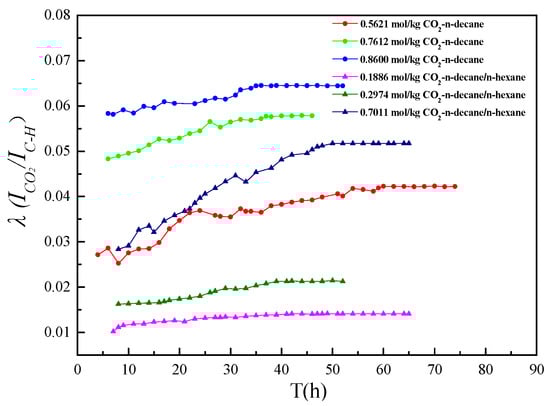 In order to determine the solubility of CO2 in n-decane or n-decane + n-hexane, the Raman spectra of CO2 + n-decane or CO2 + n-decane + n-hexane mixture at different time were collected, and then the Raman peak intensity ratios between the CO2 Fermi diad (at 1280 cm−1 and 1385 cm−1) and the C-H stretching band of n-decane or n-decane + n-hexane (at 2800–3000 cm−1) were calculated. Figure 2 shows the Raman peak intensity ratio in the mixture as it varies with time and the concentration of CO2. The Raman peak intensity ratio increases slowly with time, and then becomes stable. When the concentration of CO2 is 0.5621 mol/kg, it takes the longest time for CO2 + n-decane system to reach the phase equilibrium. It can be speculated that the first injection volume of CO2 was large, and most of the CO2 needed to be dissolved by stirring, circulation, and other operations. After 60 h of dissolution, the Raman peak intensity ratio tended to be stable. In addition, when the injection volume of CO2 increased greatly, the dissolution time of CO2 + n-decane + n-hexane to reach the phase equilibrium was longer. When the CO2 concentration was 0.7612 mol/kg, the dissolution time of CO2 + n-decane was close to that of 0.8600 mol/kg, and when the CO2 concentration was 0.1882 mol/kg, the dissolution time of CO2 + n-decane + n-hexane was close to that of 0.2974 mol/kg. These results indicated that the dissolution time to reach the phase equilibrium was different due to the injection volume of CO2.