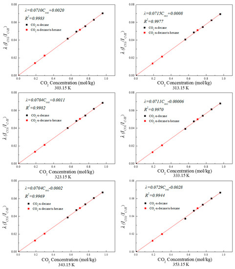 As shown in Figure 4, the Raman peak intensity ratio increased with the increase in CO2 concentration, indicating a positive linear correlation. The Raman peak intensity ratio of CO2 + n-decane + n-hexane at different temperatures and CO2 concentrations was consistent with the standard curve between CO2 concentration and the Raman peak intensity ratio of CO2 + n-decane. These results illustrate that the standard curve between CO2 concentration and the Raman peak intensity ratio of CO2 + n-decane system was suitable for CO2 + n-decane + n-hexane system.