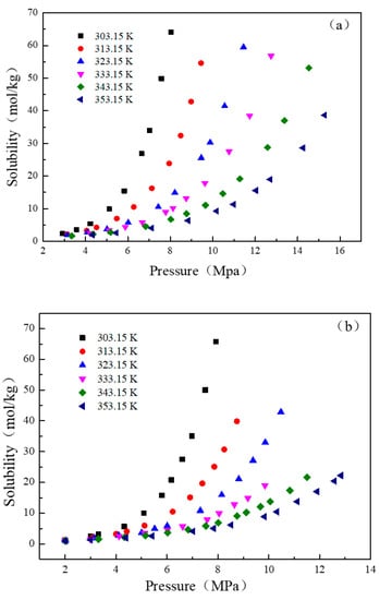 Figure 5 also shows that the solubility of CO2 in n-decane increased with the increase in pressure when the temperature was constant. Taking the solubility of CO2 at 333.15 K as an example (Figure 5a), the dissolution process could be divided into two steps. The first step was the low-pressure condition. When the system pressure was low, the solubility of CO2 increased with the increase in pressure, but the increased range was small, and the growth trend was similar to linear growth. This was probably due to the low-pressure condition under which the dissolution process of CO2 in n-decane followed Henry’s law, and the solubility of CO2 in n-decane was directly proportional to the partial pressure of CO2 in gas phase [31]. The second step was the high-pressure condition. The solubility of CO2 in n-decane increased greatly when the system pressure increased to a certain value. When the pressure increased from 9.63 MPa to 10.77 MPa, the increase in the solubility of CO2 was significantly higher than that under low-pressure condition. It can be assumed that the increase in pressure shortened the distance between CO2 molecules and enhanced the interaction force. When the intermolecular force of CO2 was nearly equivalent the intermolecular force of solvent, CO2 and n-decane were miscible and formed a homogeneous fluid, which greatly increased the solubility of CO2 [32,33].