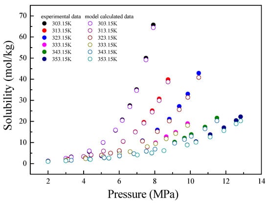 Substituting Equations (10) and (11) into Equation (9), the solubility model with parameters of pressure and temperature was obtained as follows:
