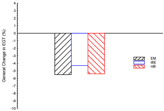 Exhaust gas temperature (EGT) average for ternary blended fuels of bio-ethanol–bio-methanol–gasoline (EM), iso-butanol–bio-ethanol–gasoline (iBE), and n-butanol–iso-butanol–gasoline (niB); gasoline is the reference line.