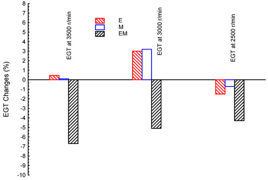 Exhaust gas temperature (EGT) at three different engine speeds (3500, 3000, and 2500 r/min) for blended fuels of bio-ethanol–bio-methanol–gasoline (EM), bio-ethanol–gasoline (E), and bio-methanol–gasoline (M); gasoline is the reference line.