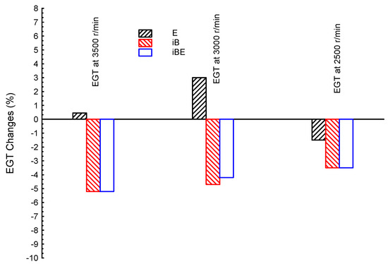 Exhaust gas temperature (EGT) at three different engine speeds (3500, 3000, and 2500 r/min) for blended fuels of iso-butanol–bio-ethanol–gasoline (iBE), bio-ethanol–gasoline (E), and iso-butanol–gasoline (iB); gasoline is the reference line.