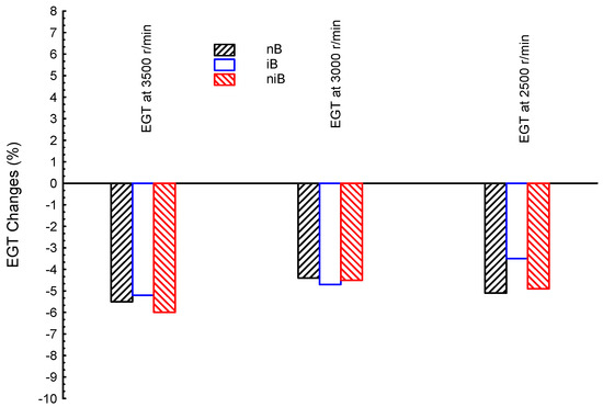 Exhaust gas temperature (EGT) at three different engine speeds (3500, 3000, and 2500 r/min) for blended fuels of n-butanol–iso-butanol–gasoline (niB), iso-butanol–gasoline (iB), and n-butanol–gasoline (nB); gasoline is the reference line.