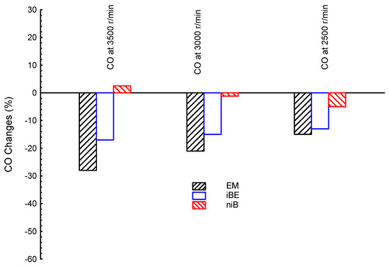 CO emissions at three different engine speeds (3500, 3000, and 2500 r/min) for ternary blended fuels of bio-ethanol–bio-methanol–gasoline (EM), iso-butanol–bio-ethanol–gasoline (iBE), and n-butanol–iso-butanol–gasoline (niB); gasoline is the reference line.