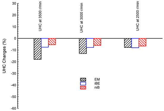UHC emission at three different engine speeds (3500, 3000, and 2500 r/min) for ternary blended fuels of bio-ethanol–bio-methanol–gasoline (EM), iso-butanol–bio-ethanol–gasoline (iBE), and n-butanol–iso-butanol–gasoline (niB); gasoline is the reference line.