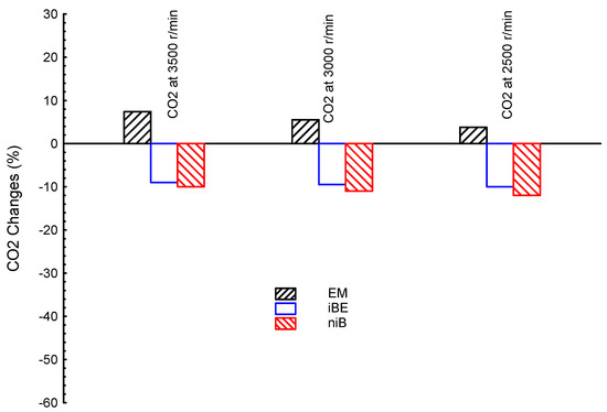 CO2 emission at three different engine speeds (3500, 3000, and 2500 r/min) for ternary blended fuels of bio-ethanol–bio-methanol–gasoline (EM), iso-butanol–bio-ethanol–gasoline (iBE), and n-butanol–iso-butanol–gasoline (niB); gasoline is the reference line.