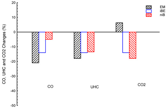 CO, CO2, and UHC emissions averages for ternary blended fuels of bio-ethanol–bio-methanol–gasoline (EM), iso-butanol–bio-ethanol–gasoline (iBE), and n-butanol–iso-butanol–gasoline (niB); gasoline is the reference line.
