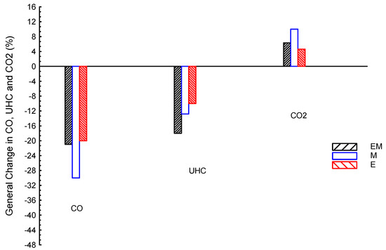 CO, CO2, and UHC emissions averages for ternary blended fuels of bio-ethanol–bio-methanol–gasoline (EM), bio-ethanol–gasoline (E), and bio-methanol–gasoline (M); gasoline is the reference line.