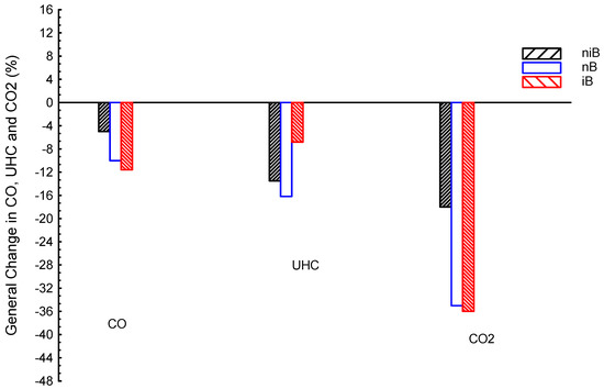 CO, CO2, and UHC emissions averages for blended fuels of n-butanol–iso-butanol–gasoline (niB), n-butanol–gasoline (nB), and iso-butanol–gasoline (iB); gasoline is the reference line.
