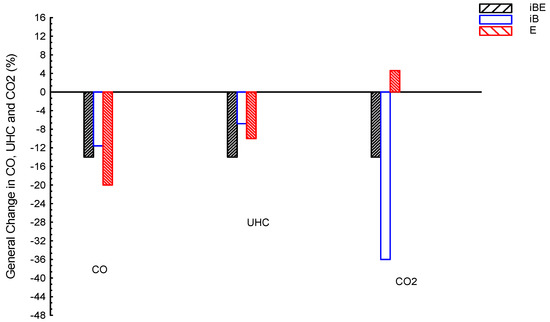 CO, CO2, and UHC emissions averages for blended fuels of iso-butanol–bio-ethanol–gasoline (iBE), iso-butanol–gasoline (iB), and bio-ethanol–gasoline (E); gasoline is the reference line.
