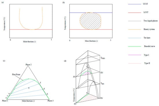 Phase diagrams: (a) a binary system exhibiting lower critical solution temperature (LCST). Adapted from []; (b) a binary system exhibiting both upper critical solution temperature (UCST) and lower critical solution temperature (LCST). Adapted from []; (c) a triangular plot for a ternary system with only one of the binary pairs exhibiting partial miscibility—type I. Adapted from []; (d) effect of temperature on ternary liquid–liquid equilibrium. Adapted from []. (FS, S, and ES are feed solvent, solute, and extraction solvent, respectively. TSES is the critical temperature of the solute and extraction-solvent binary, and TFSES is the critical temperature of the feed solvent and extraction-solvent binary.