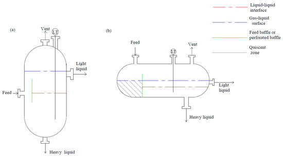 Vented decanters: (a) Vertical decanter with submerged feed. Adapted from []; (b) Horizontal decanter with feed entering from the top and a baffled quiescent zone. Adapted from [].