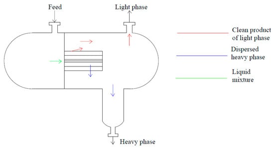 Coalescing internals can be applied to pre-treat decanter feeds in separate coalescer vessels [,]. Coalescers are particularly used for type III and IV systems (see Table 1). Benefits of coalescing internals are improved separation efficiency, reduced operating costs, and increased throughput. The configuration of coalescers depends on the dispersed phase. For the light phase being dispersed, the configuration is upflow, and for the heavy phase being dispersed, the configuration is downflow. Coalescers are typically packed with granular materials, metal wire meshes, polymer filaments (or both), or fine fibers in woven or nonwoven composite sheets []. Coalescers can tolerate feeds containing fine solids if granules or wire meshes are used. The feed should be free of solids for coalescers containing fine granules or fibers to avoid potential requirement for pre-filtration [,,,]. A standard design for a coalescer is given in Figure 4. The liquid mixture enters at one end of the vessel (feed). Then, liquids flow (1) through the coalescer elements inside the vessel, separate, and discharge at respective outlets: (2) clean product of light phase, and (3) dispersed heavy phase. Generally, the best coalescer performance is achieved when the dispersed phase wets the packing material. [].