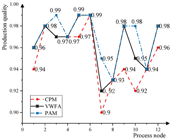 Compared with CPM, the optimized production quality improvement of VWFA under the constraint of expectations is Δ = (ƒq − ƒq1)/ƒq1 × 100% = 10.5%. Compared with PAM, VWFA reduces the time by 9.1% to meet the time constraint and saves 13.7% of the cost. This result demonstrates that the algorithm VWFA has scheduling advantages under a limited range of EC constraints.