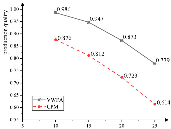 The cumulative production quality of the work-flow model is directly influenced by the production quality of each process node. A random number containing {10, 15, 20, 25} process nodes set P, corresponding to the number of {1, 2, 3, 4, 5} in the transfer node set T, is randomly generated. The effect of the change in the number of process nodes on the performance of the CPM and VWFA algorithms is shown in Figure 5.