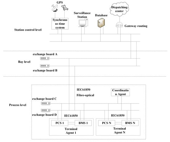 In the actual operation of power grids, the condition of network communication is an important factor that affects the effectiveness of multi-agent collaborative control. At the same time, in the new smart grid, the communication carrier for multipoint distributed energy storage is mainly optical fiber, with high communication reliability. Therefore, the default communication delay between agents in this article is within the allowable error range, regardless of the impact of communication exceptions on the control effect of multiple agents, to ensure the timeliness and effectiveness of information transmission. The entire station communication adopts a dual network redundancy communication arrangement. The station control level communicates with the upper dispatching center data network through gateway, switches, and longitudinal encryption. The station control level is connected to the bay level, the bay level to the process level, and each agent through optical fiber. The IEC 61850 communication protocol is adopted. The specific communication method and architecture are shown in the Figure 9.