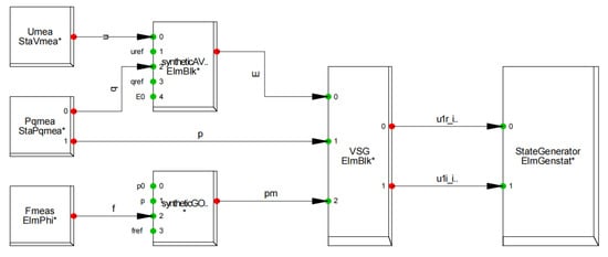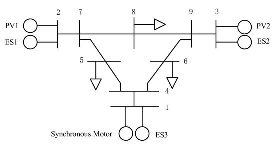 Based on the aforementioned cooperative control strategy and algorithm of multiple energy storage agents, the power system simulation model, including multi-point distributed energy storage, is established using DIgSILENT simulation software. The system includes photovoltaic, energy storage, synchronous motor and load. Nodes 2 and 3 are, respectively, connected with photovoltaic and energy storage devices, node 1 is connected with synchronous motor and energy storage devices, and nodes 5, 6 and 8 are connected with the load. The example simulation system is shown in Figure 10, the VSG block diagram of the energy storage agent in DIgSILENT is shown in Figure 11 (the control quantities in the figure have been described in Section 3.1) and node parameter settings are shown in Table 1.