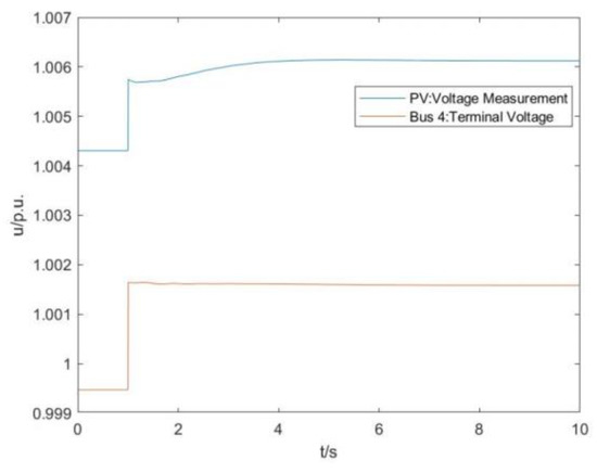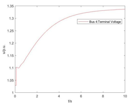As can be seen from Figure 13, the voltage at Bus 4 increases rapidly after 1 s and tends to stabilize after about 10 s, with a stable value of 0.32 p.u. higher than the initial value.