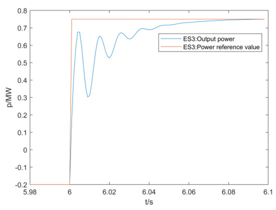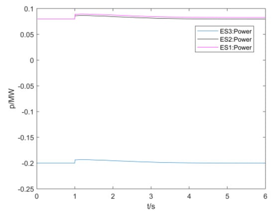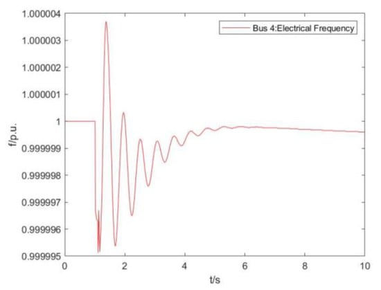 It can be seen from Figure 14 that the frequency of the system oscillates after 1 s and then tends to stabilize after about 8 s, and the stable value is 0.0001 Hz lower than the initial value. When the virtual synchronization control strategy is applied, the system frequency can oscillate and stabilize after the failure, and the frequency fluctuation range is small.