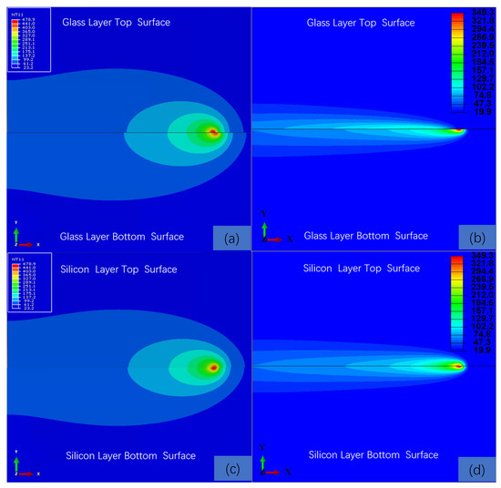 Figure 7c,d shows the temperature field and stress field distribution on the upper surface of the glass layer and the lower surface of the silicon layer at a high speed scanning time of 0.175 s. At this point, after the crack started at the cut entrance, the distance between the laser spot and the leading edge of the crack increased rapidly. The stress field distribution showed that the glass layer had the highest stress value near the interface, while the silicon layer had the highest stress value near the outer surface. This was basically consistent with the stress distribution and shape of the crack’s leading edge in the low-speed scanning, but the crack’s leading edge span was significantly increased.