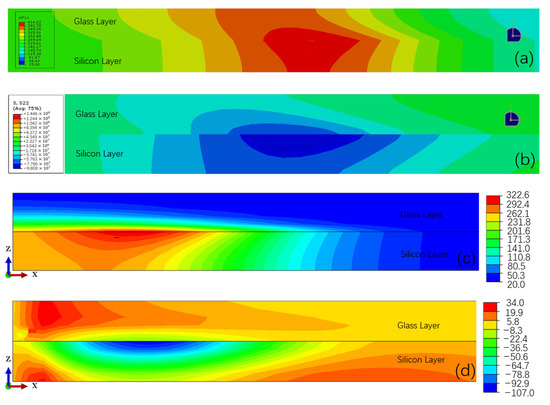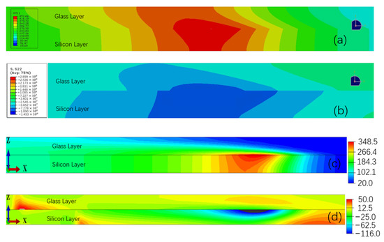 Figure 6c,d shows the temperature field and stress field distribution on the upper surface of the glass layer and the lower surface of the silicon layer at a high speed scanning time of 0.039 s. At this time, the laser spot center was located at the edge of the workpiece, and the maximum temperature of the workpiece was 322.6 °C, which had not yet reached the historical maximum temperature of 348.77 °C in the stable extension stage.