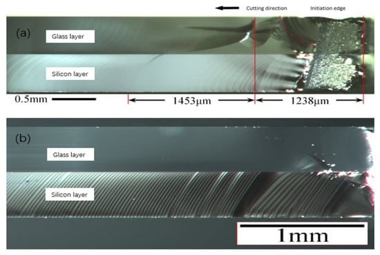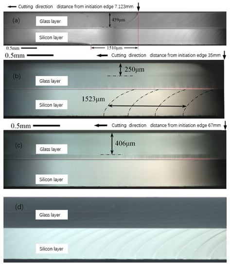 From the section photos in Figure 9a–c, the section was smooth after 10 mm from the cracking edge, where the periodic ripple lines in the silicon layer section were barely visible. In contrast, the glass layer cross section only had obvious horizontal ripple lines, which visually indicates that the cross section quality had been greatly improved at high scanning speeds. According to the laser-induced thermal cracking scribing glass mechanism, the plate was not cut as a whole, the crack only extended in the shallow surface area of the plate, the stress formed a large gradient in the thickness direction, the compressive stress zone below the crack restricted the further expansion of the crack to the depth, and the subsequent mechanical method made the shallow-induced thermal cracking scribing process extend the crack to achieve the cutting of the plate. Therefore, the glass section processed by the induced thermal cracking scribing method will have a distinct horizontal corrugation line, which appears at the same location as the crack extension depth of the first step of the induced thermal cracking scribing. The horizontal ripple line also appeared during the high-speed cutting process, which indicates that the region of the glass layer near the upper surface was not cracked synchronously with the silicon layer, the crack expansion pattern inside the glass/silicon double bonded flat plate changed, and the crack expansion in the glass layer material was non-synchronous with the silicon layer.