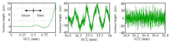 significantly compared to the low-speed scan condition (as shown in Figure 10a,b), as shown in Figure 11b,c. The surface roughness Ra of the silicon